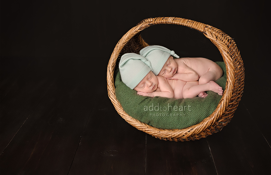 Twin brothers in large circular wicker basket. Portrait by Add to Heart Photography