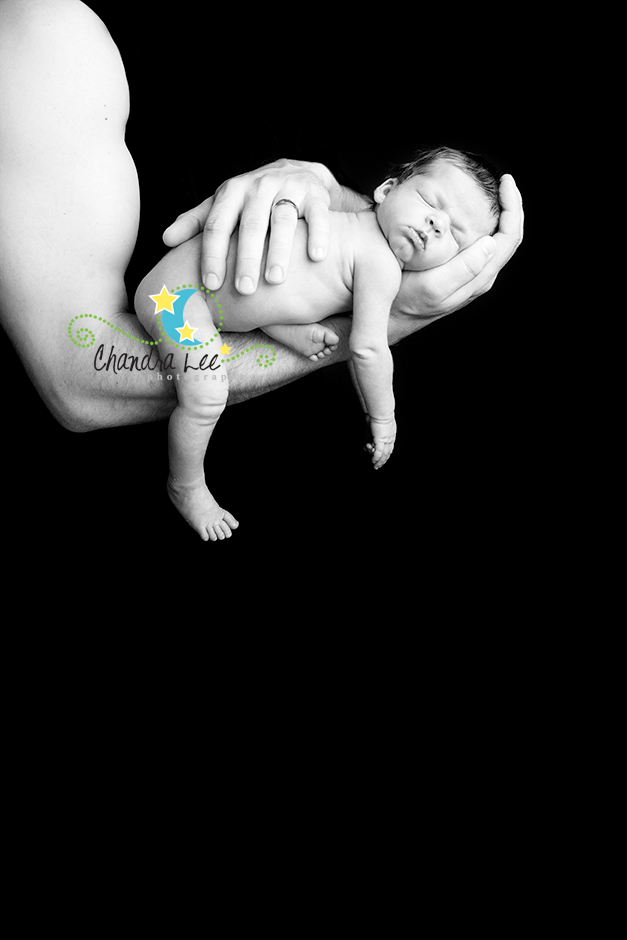 Image of newborn being posed on dad's arm.