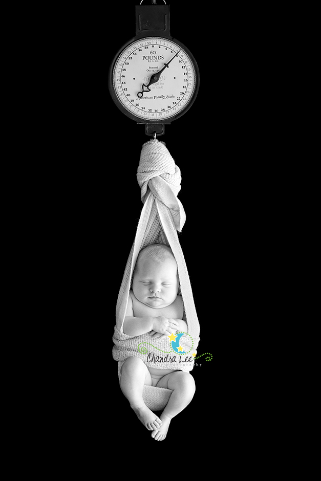 One of my favorite ways to pose a newborn in a sling. This photograph is taken with baby sleeping on a posing pillow and the scale is photographed separately and then put together in Photoshop.